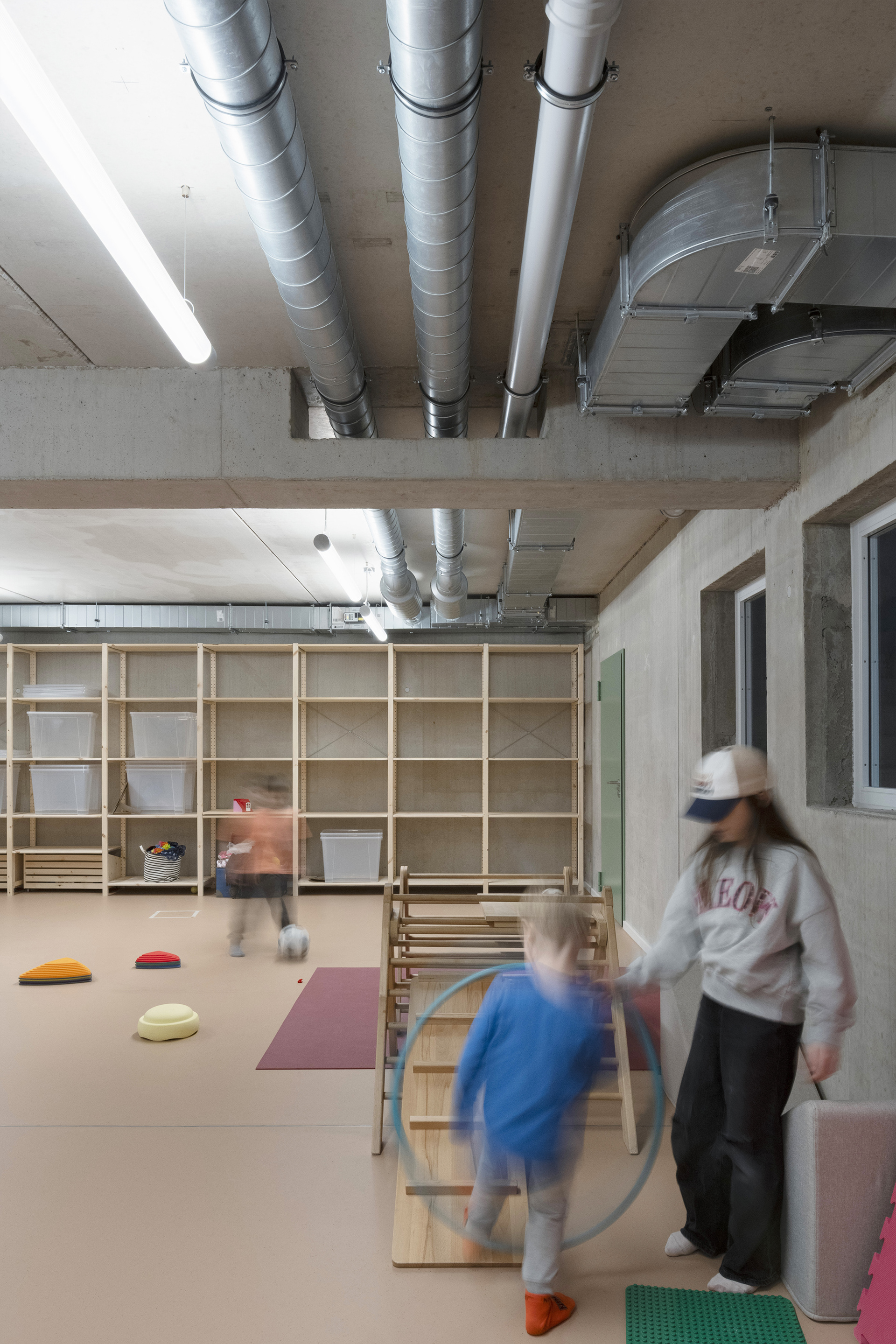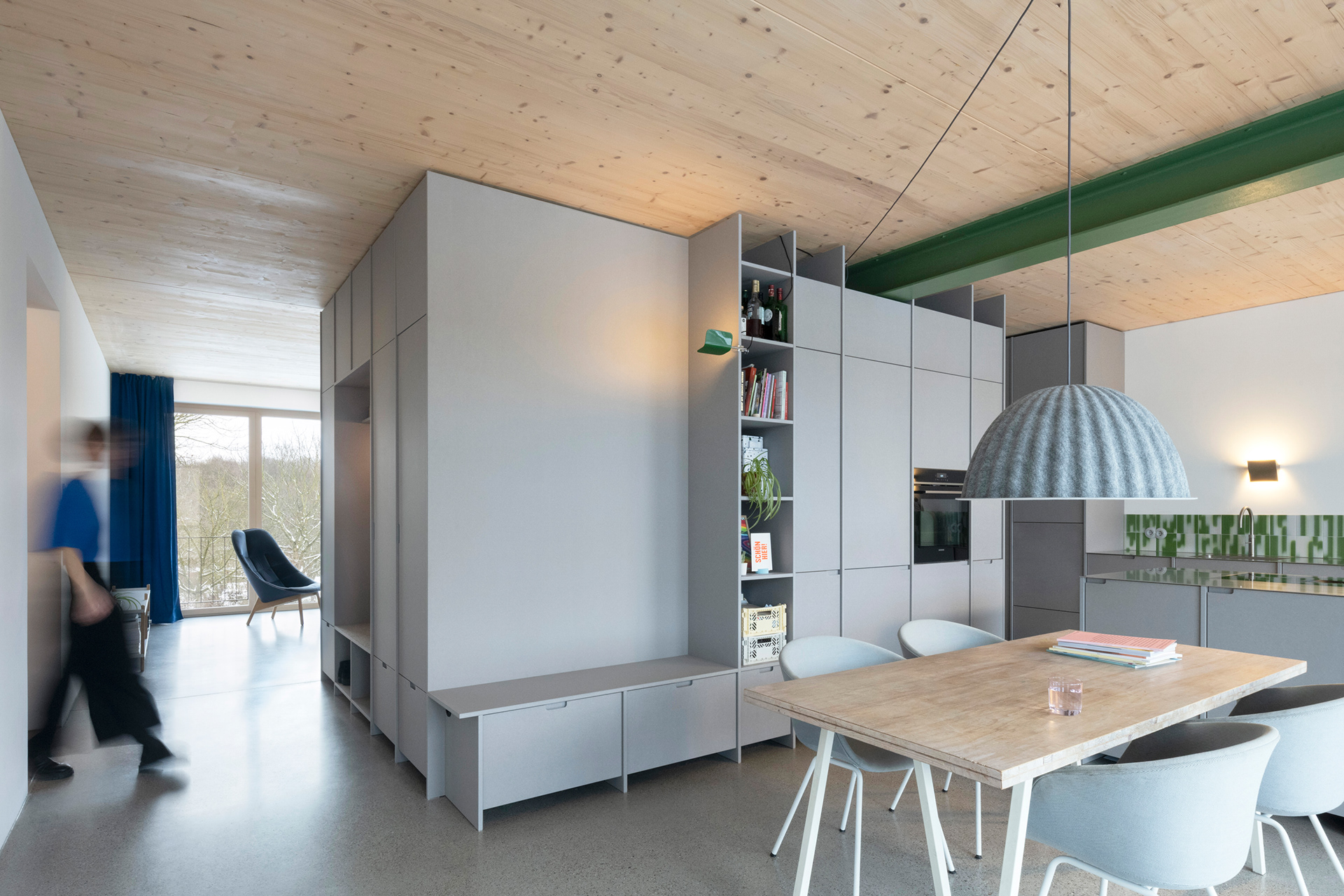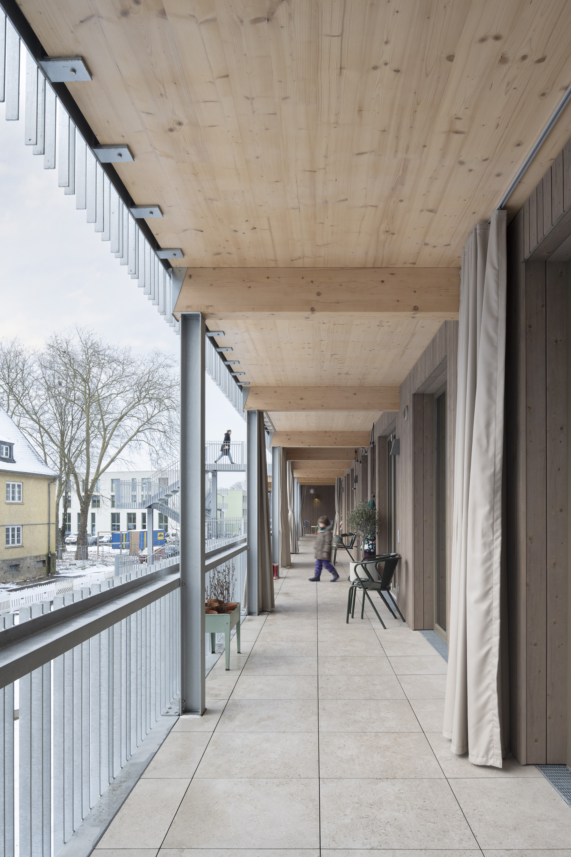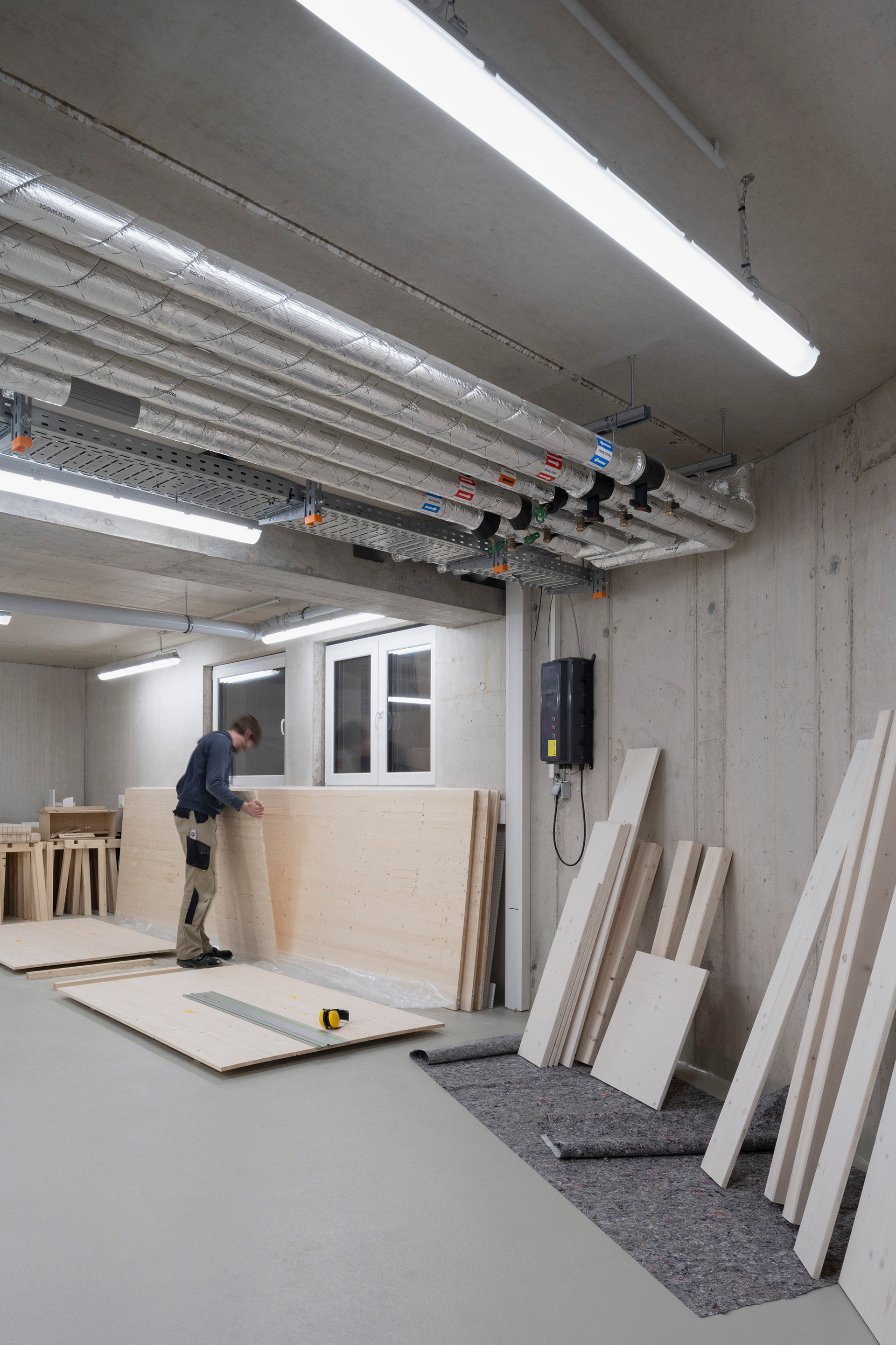 KliQ verfolgt einen klaren Low-Tech-Ansatz: Robuste, wartungsarme Konstruktionen, einfache Details und langlebige Materialien reduzieren technische Komplexität und sichern langfristige Nutzbarkeit. Auf einem massiven Sockel wurde das Gebäude weitgehend in Holzbauweise errichtet. Brettsperrholzdecken, Holzrahmenbauwände und eine Holzfassade aus skandinavischem Fichtenholz binden rund 1.000 Tonnen CO2 und machen den bewussten Einsatz nachwachsender Baustoffe sichtbar. Der reduzierte Materialkanon folgt sowohl ökologischen als auch gestalterischen Prinzipien und prägt die klare, ruhige Architektursprache.