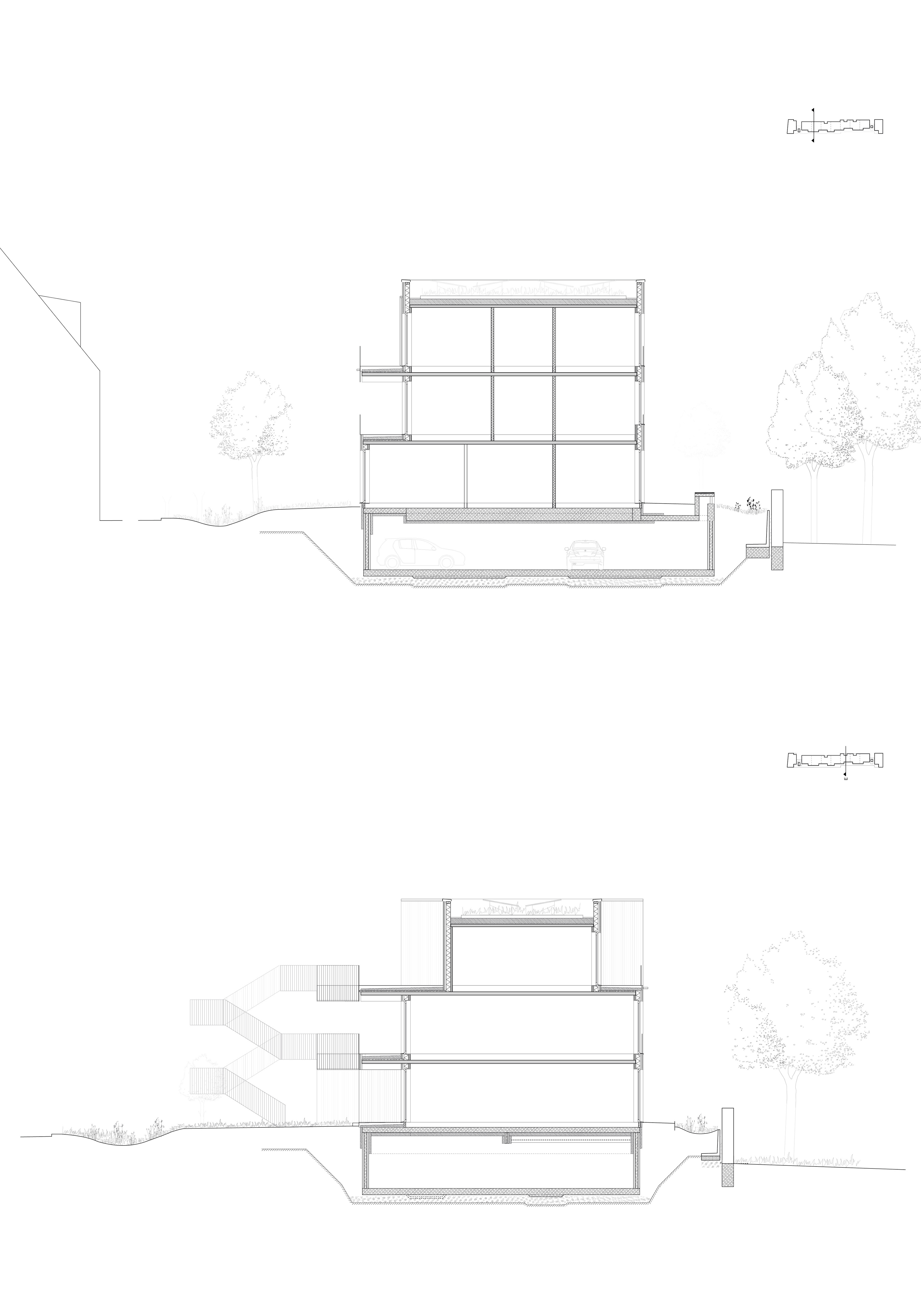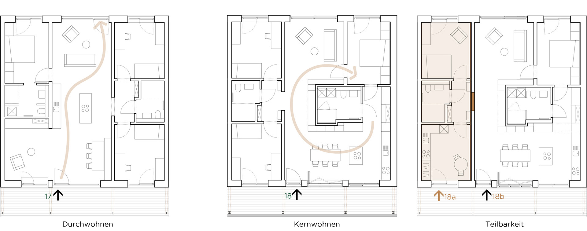 Die Grundrisse sind seriell entwickelt, kompakt organisiert und zugleich flexibel nutzbar. Eine Ost-West-Durchorientierung, großzügige Öffnungen und gut proportionierte Räume sorgen für hohe Aufenthaltsqualität, gute Belichtung und natürliche Belüftung. Größere Wohnungen sind teilbar und lassen sich an unterschiedliche Lebensphasen und Haushaltsformen anpassen – vom generationenübergreifenden Wohnen bis zu Care- oder Vermietungsszenarien. Alle Geschosse sind barrierefrei erschlossen.