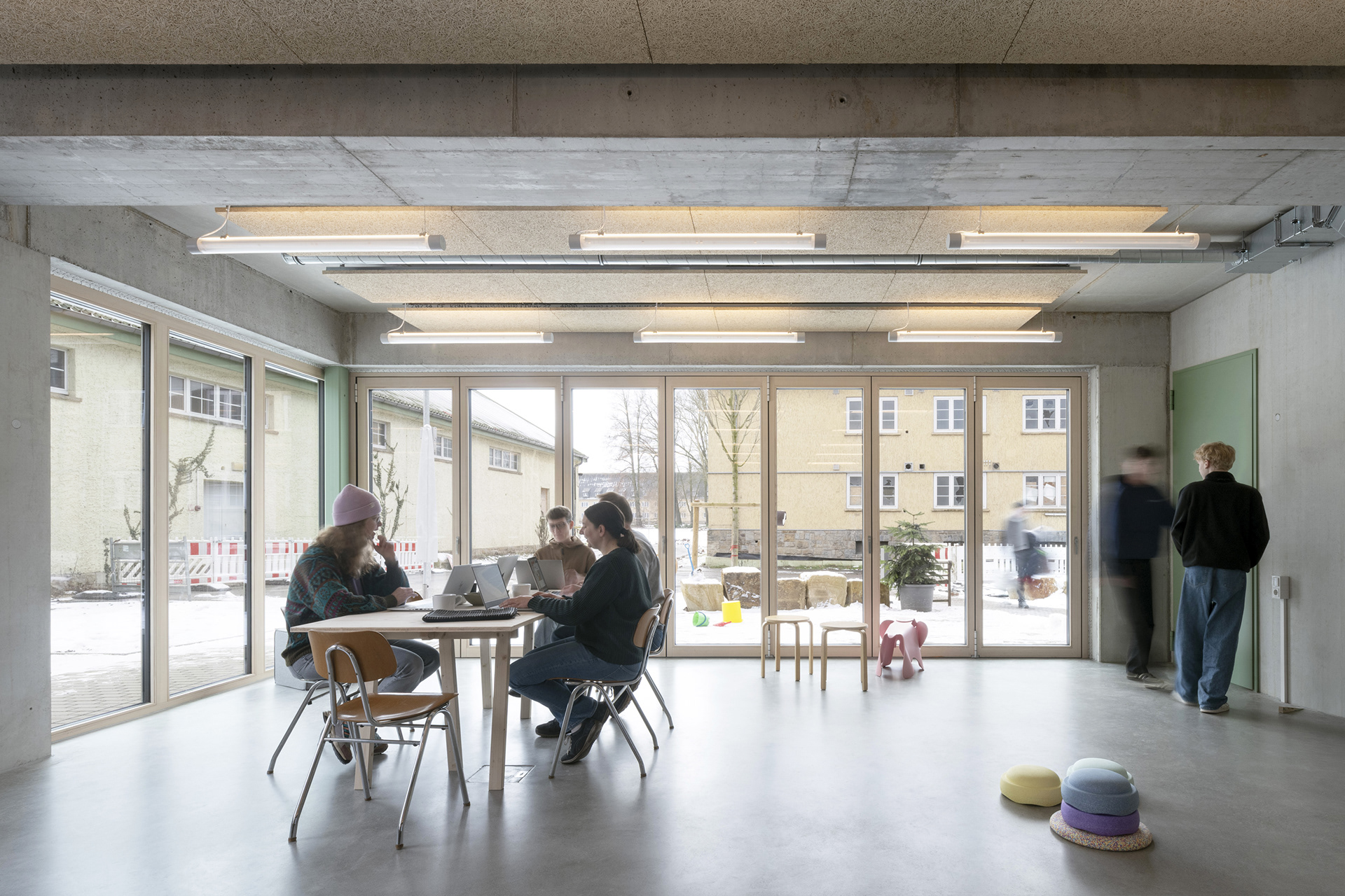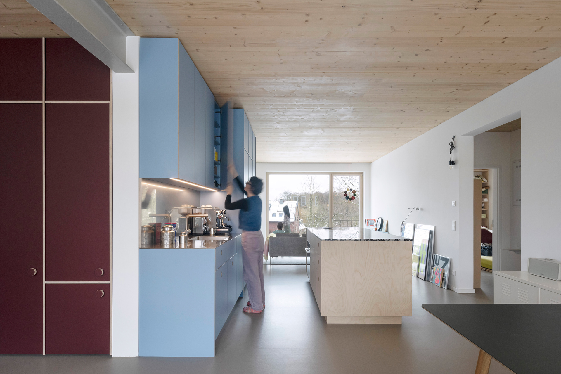 Ein zentraler Anspruch des Projekts ist der bewusste Umgang mit Fläche und Material. Durch die konsequente Verlagerung privater Nutzungen in gemeinschaftlich organisierte Räume wird der individuelle Wohnflächenbedarf deutlich reduziert, ohne auf Wohnkomfort zu verzichten. Der Pro-Kopf-Flächenverbrauch liegt unter 30 m2. Herzstück dieses Konzepts ist der KliQ-Space als gemeinschaftlicher Arbeits-, Begegnungs- und Aufenthaltsort mit Küche, ergänzt durch Gästeapartments, Werkstatt, Waschraum und einen großzügigen Gemeinschaftsgarten. Diese geteilten Angebote fördern soziale Interaktion, stärken Nachbarschaft und ermöglichen zugleich bezahlbares Eigentum für eine heterogene Bewohnerschaft.