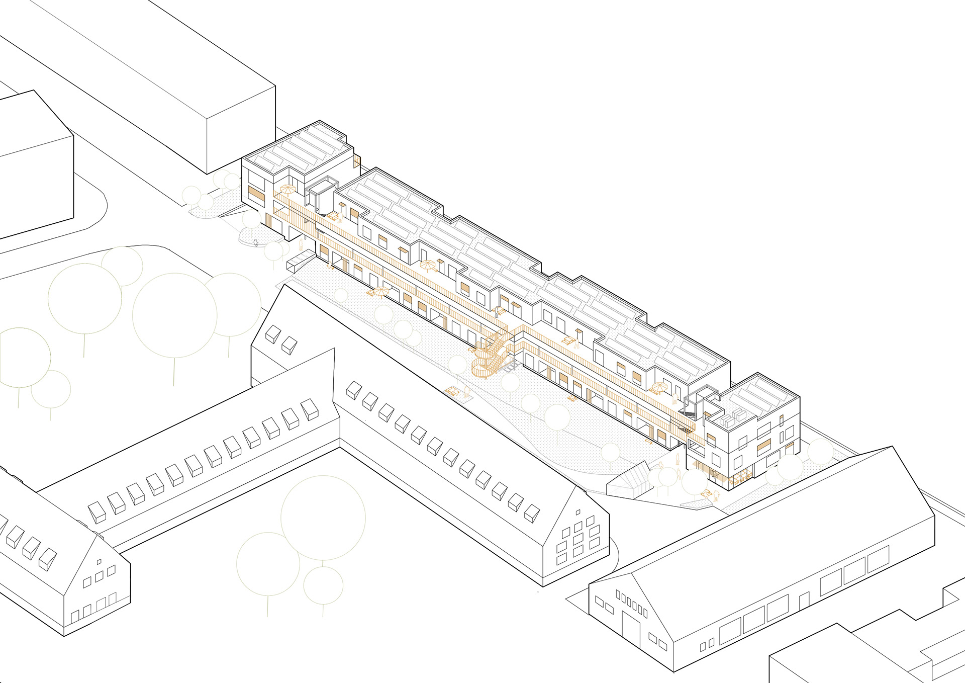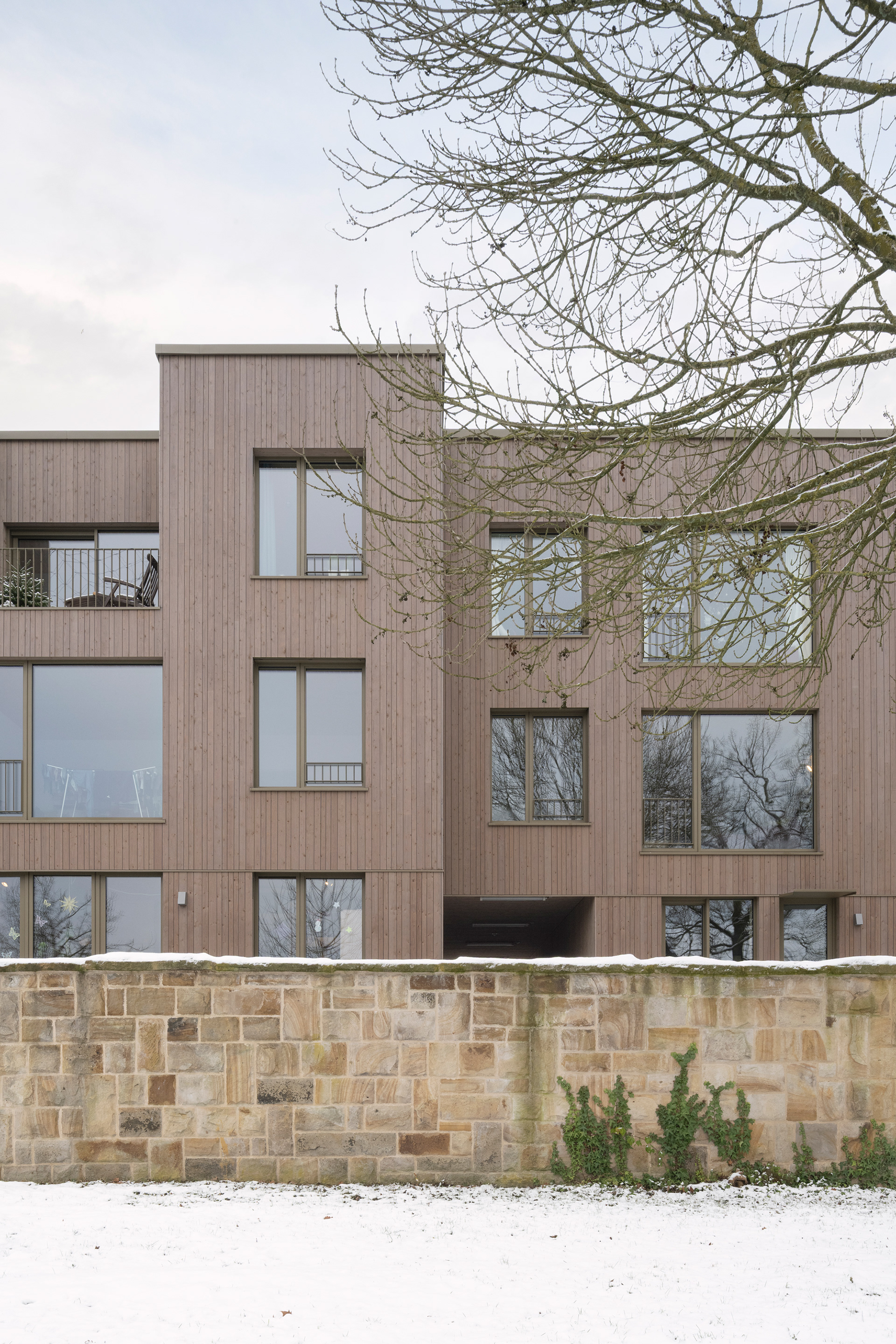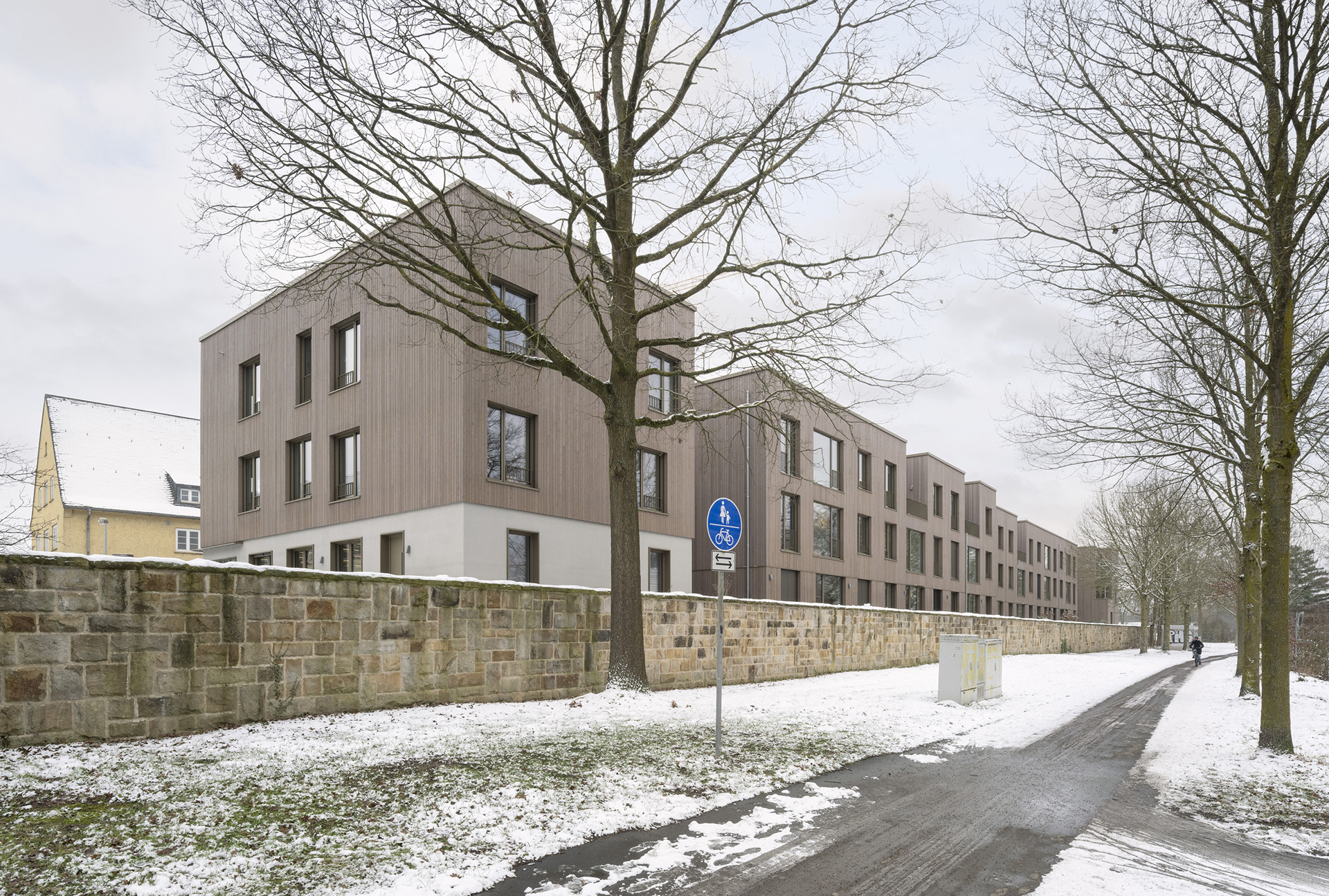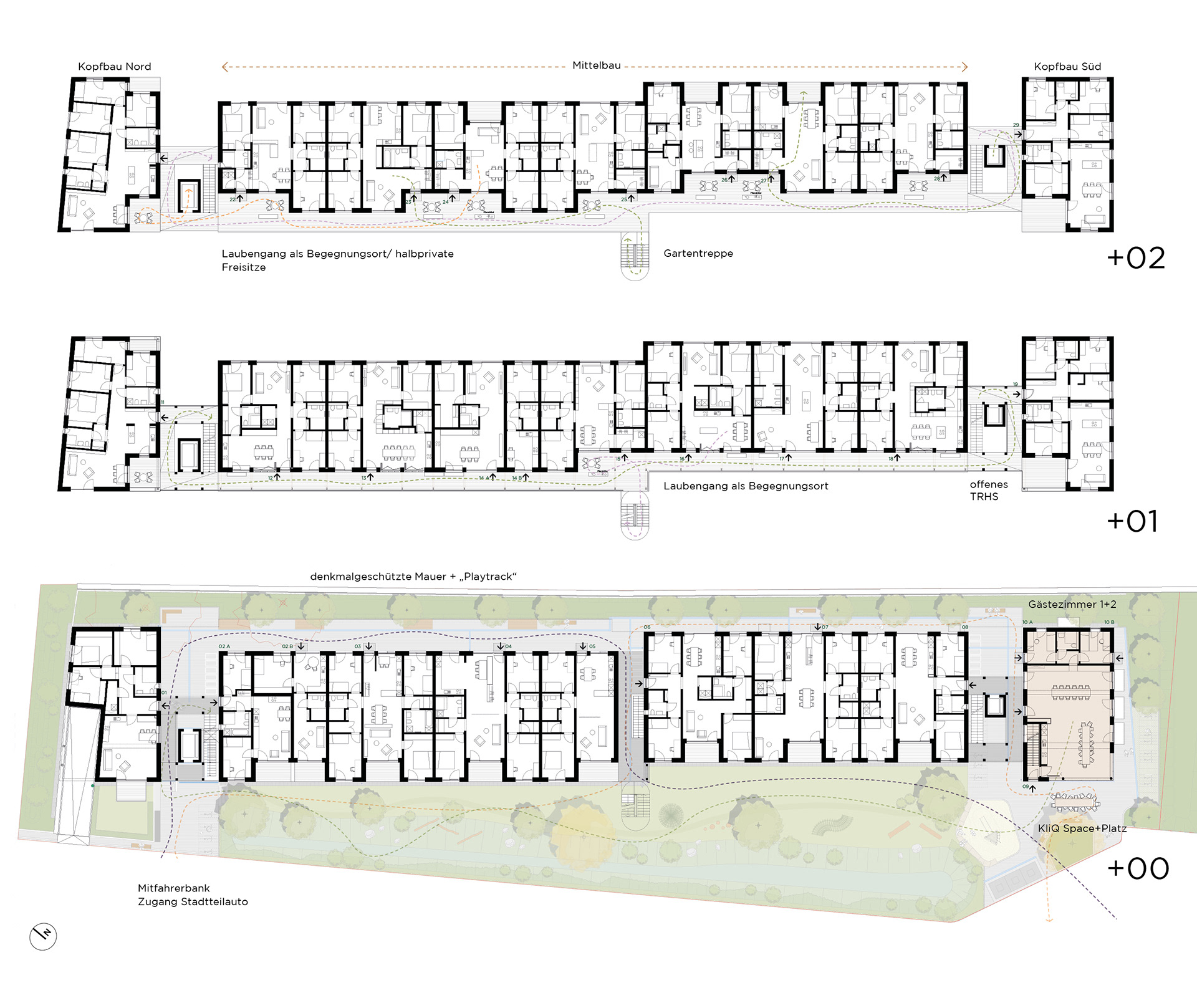 Die Energieversorgung kombiniert Geothermie mit Fernwärme und wird durch passive Maßnahmen wie kompakte Baukörper, gute Dämmstandards und natürliche Belichtung ergänzt. Retentionsdächer mit Begrünung und Photovoltaik unterstützen das Schwammstadtprinzip und verbessern das Mikroklima. Der naturnah gestaltete Freiraum mit Spiel- und Aufenthaltsflächen bildet zusammen mit dem „Playtrack“ entlang der historischen Sandsteinmauer eine lebendige Schnittstelle zwischen Haus, Quartier und Landschaft.