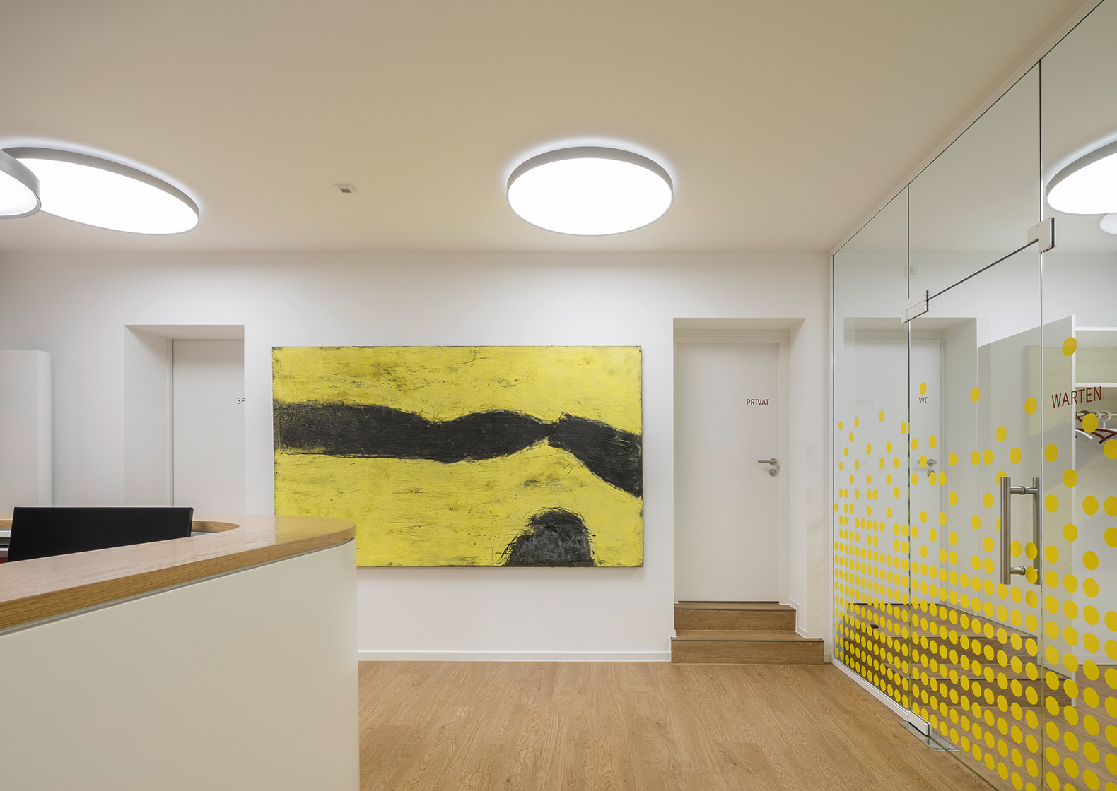 Umbau und Sanierung einer Praxis für Allgemeinmedizin - das Konzept für ein zeitgemäßes Healing Environment sieht vor, sowohl die Corporate Identity als auch die Persönlichkeit des Arztes neben den funktionalen Anforderungen in die neue Praxisgestaltung mit einfließen zu lassen. Das Healthcare Interior soll dabei zum einen den Patienten mit Lebensfreude Willkommen heißen und ihm zum anderen Orientierung auf dem vertrauensbildenden Weg zur Heilung bieten. Farben und Grafikelemente, die aus dem vorhandenen Corporate Design übernommen werden, finden sich auf neuen Glaswänden, im Kautschukboden, auf den individuellen Einbaumöbeln und auch im neuen Lichtkonzept wieder. So entsteht eine unverwechselbare Atmosphäre, für die sich Patienten gerne entscheiden, weil sie sich gut aufgehoben fühlen.