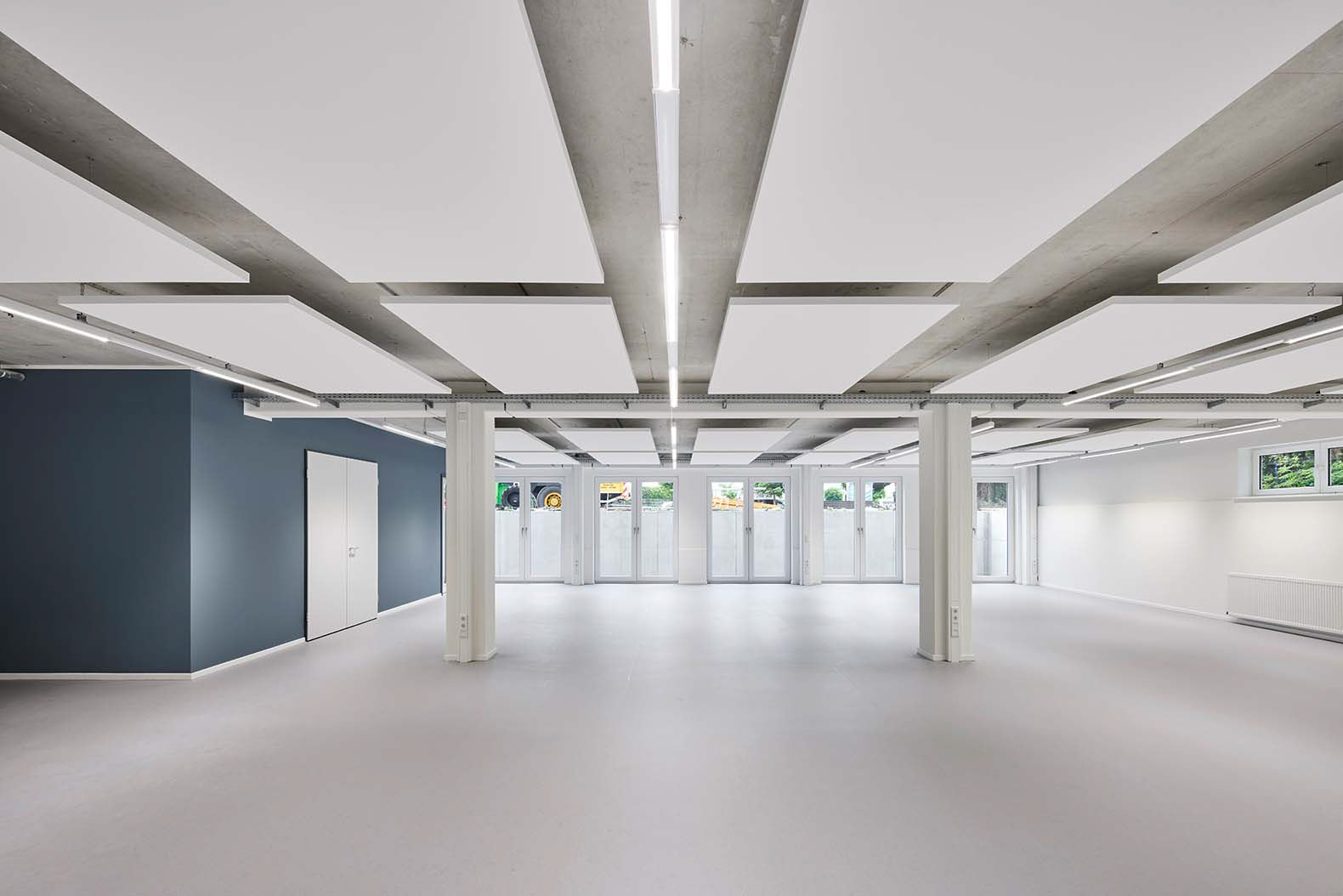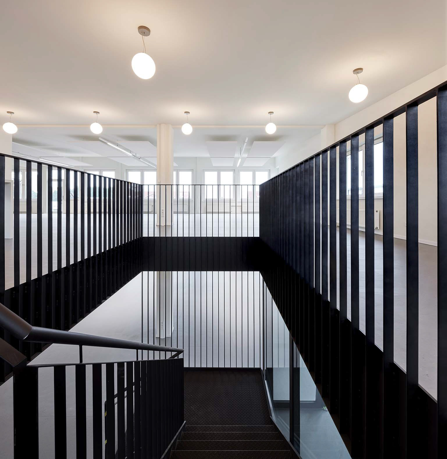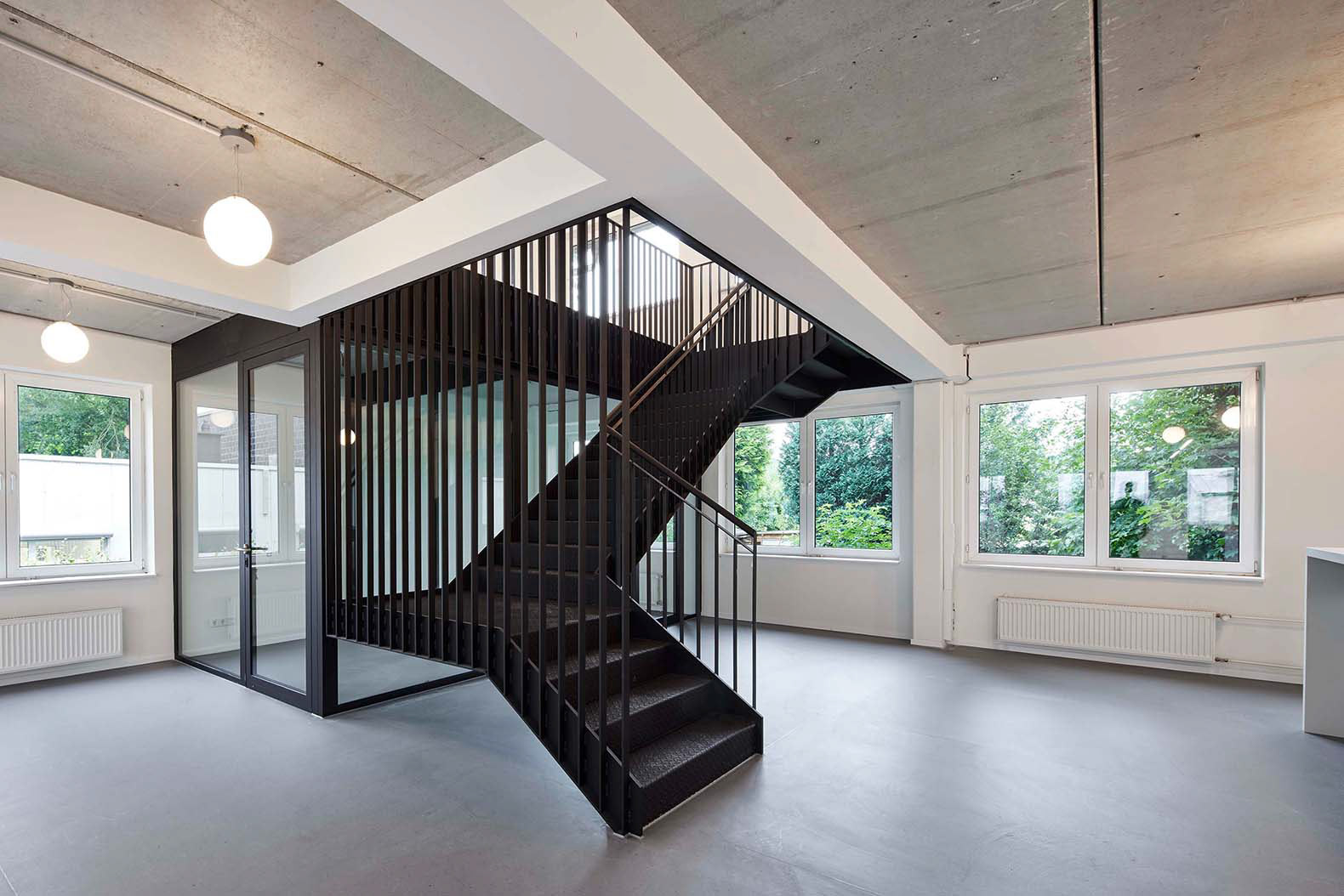 Beim Umbau von zwei Büroimmobilien in Münster-Hiltrup für den Verbund Sozialtherapeutischer Einrichtungen NRW ging es im Kern darum, diese zu einem Ensemble zusammen zu führen und räumlich stärker miteinander zu verknüpfen. Neben einer offenen Bürolandschaft über zwei Etagen gehört ein großer Multifunktionsraum für den basisdemokratischen Verein ebenso zum Raumprogramm wie geschützte Begegnungsräume, die dem Kontakt zwischen Pflegekindern, -familien und den leiblichen Eltern dienen. Eine vorgestellte Balkonkonstruktion in Stahl mit integriertem Aufzug ermöglicht sowohl die barrierefreie Erschließung als auch die dringen benötigte passive Verschattung der Büroflächen. Der Innenraum wurde soweit zurückgebaut, dass der Rohbau wieder zum Vorschein kommt. Notwendige neue Installationen wurden Aufputz verlegt, alles, was zudem neu hinzugefügt wurde, wie Akkustiksegel, die innenliegende Stahltreppe oder Raumteiler, sind inklusive ihrer Rückbaubarkeit konzipiert.